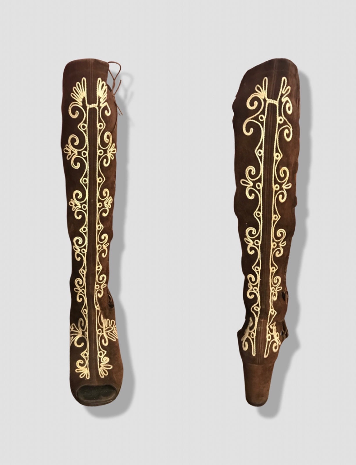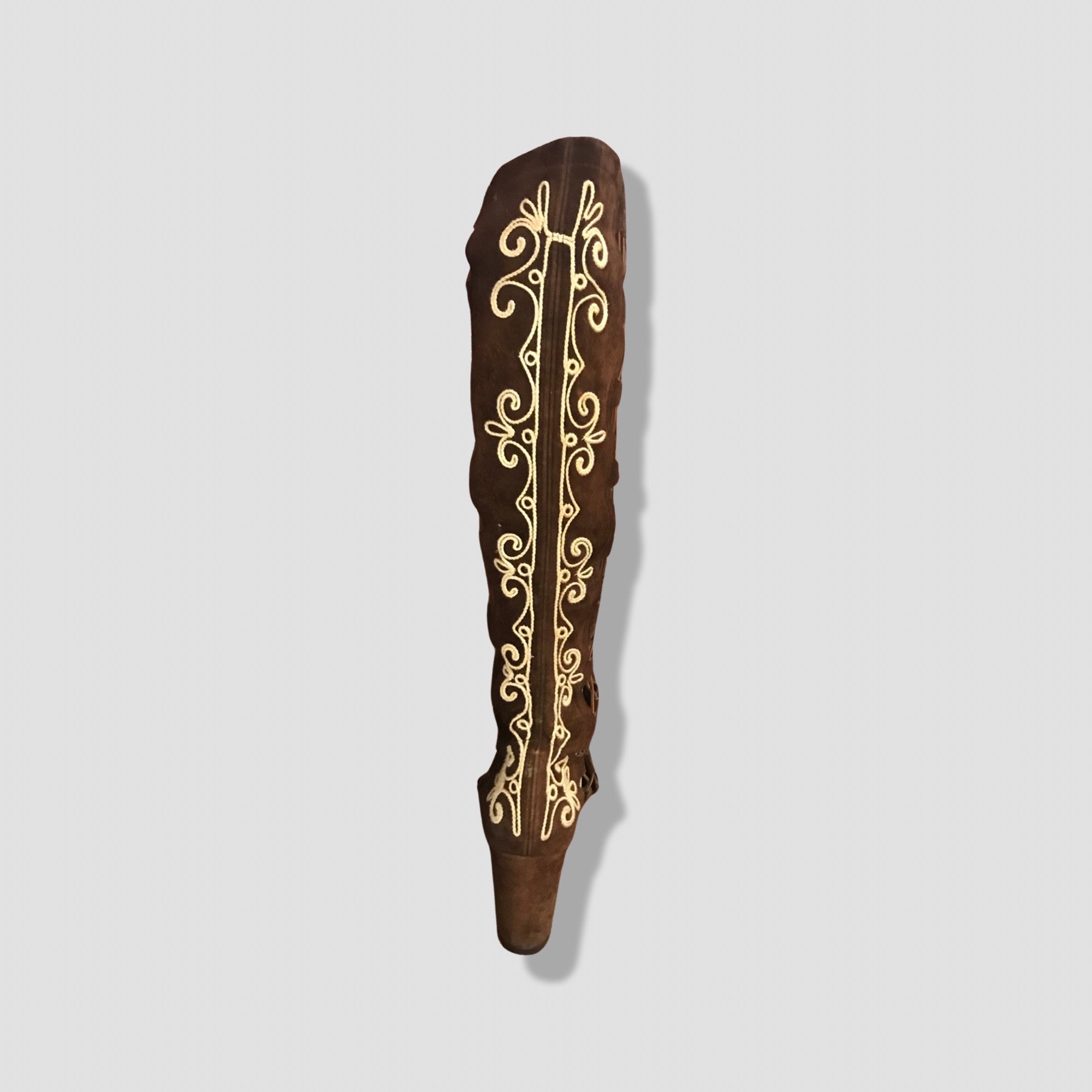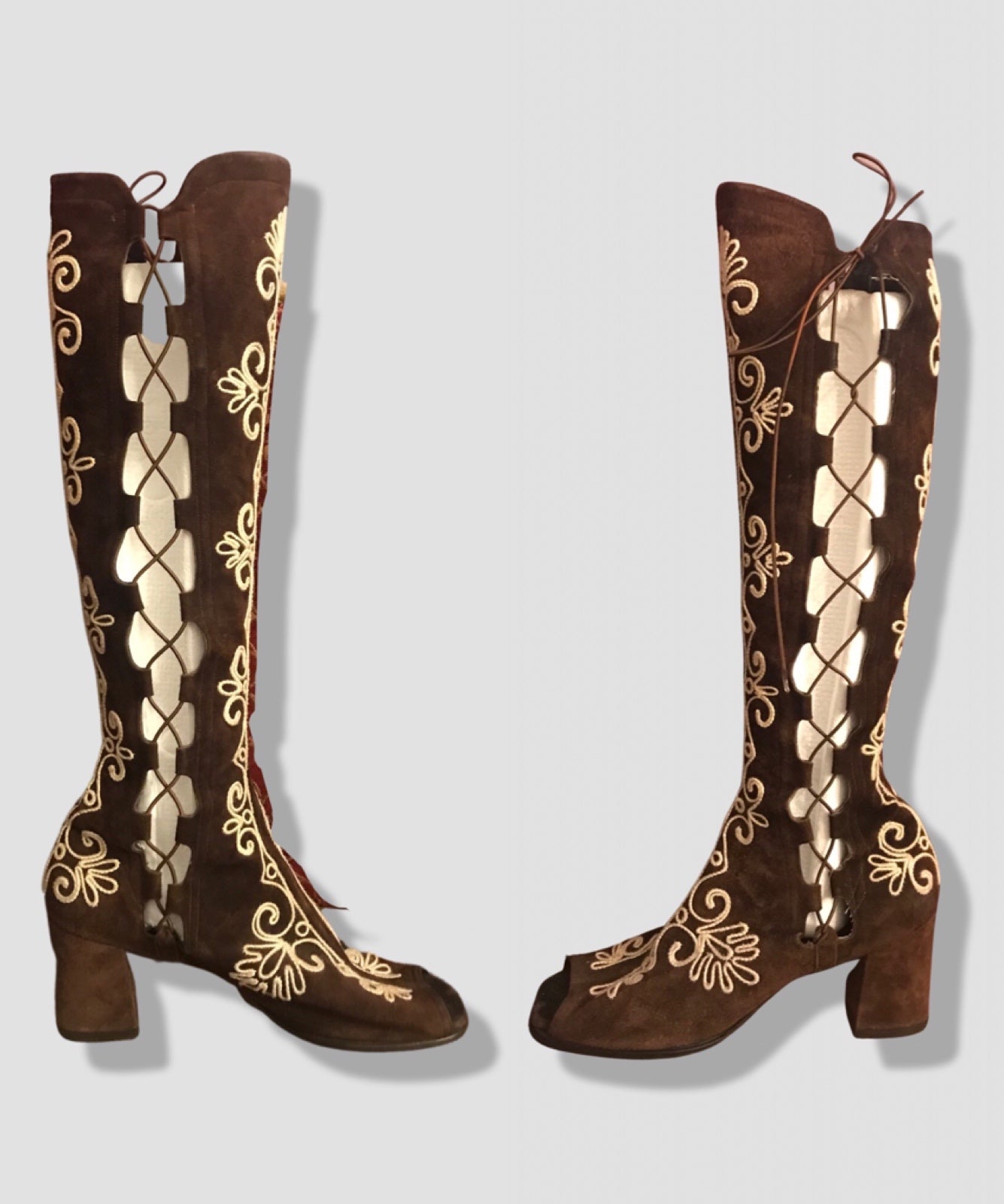 These groovy rare boots are made of thick suede with embroidered white design throughout. White embroidery has an exotic flare.