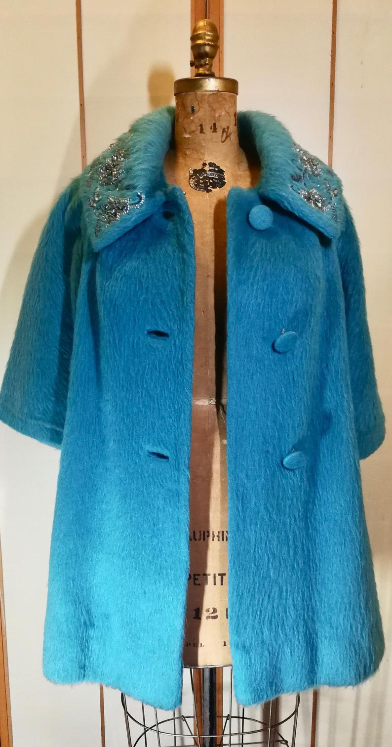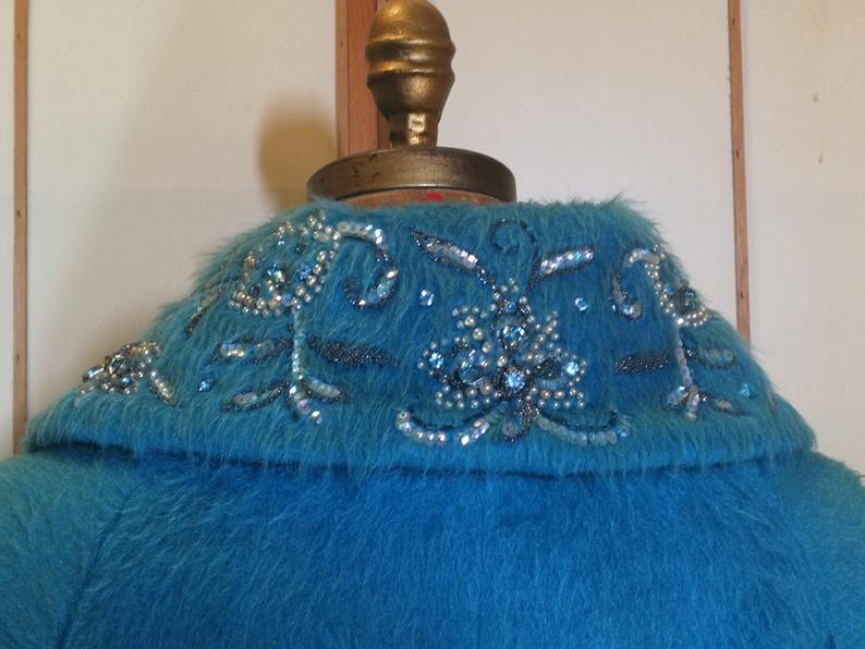 Lilli Ann Swing Mohair Blue Aqua Turquoise Hand Beaded Jeweled Embroidered Wool Luxury S/M/L Pinup 50s 60s Mad Men Mod